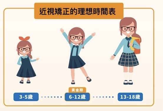6至12歲的兒童眼睛正處於成長階段,是近視矯正的黃金時期,而且越早發現視力問題,就能及早處理。因此必須儘早讓小孩接受視力管理方案,以降低近視帶來的眼疾風險。但請注意,現在並沒有一種防止或永久逆轉近視的方法,只能避免視力惡化喔!