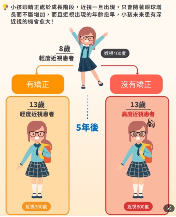 為什麼近視必須要趁早管理呢?因為小孩的眼睛正處於成長階段,若是近視一旦出現,只會隨著眼球增長而不斷增加,而且近視出現的年齡愈早,小孩未來患有高度近視的機會愈大!
